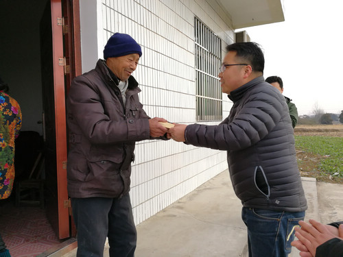 在春节来临前夕,2月4日、8日,公司总经理周航旭带上慰问金和慰问物资来到钟祥市乔坡村、东桥村分别看望慰问村老党员和困难群众。